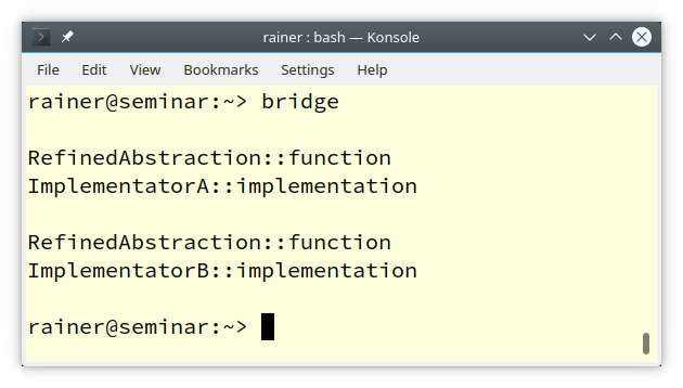// bridge.cpp #include <iostream> class Implementor { // (1) public: virtual void implementation() const = 0; virtual ~Implementor() = default; }; class ImplementorA: public Implementor { public: ImplementorA() = default; void implementation() const { std::cout << "ImplementatorA::implementation" << '\n'; } }; class ImplementorB: public Implementor { public: ImplementorB() = default; void implementation() const { std::cout << "ImplementatorB::implementation" << '\n'; } }; class Abstraction { // (2) public: virtual void function() const = 0; virtual ~Abstraction() = default; }; class RefinedAbstraction: public Abstraction { public: RefinedAbstraction(Implementor& impl) : implementor(impl) { } void function() const { std::cout << "RefinedAbstraction::function\n"; implementor.implementation(); } private: Implementor& implementor; }; int main() { std::cout << '\n'; ImplementorA implementorA; ImplementorB implementorB; RefinedAbstraction refinedAbstraction1(implementorA); // (3) RefinedAbstraction refinedAbstraction2(implementorB); // (4) Abstraction *abstraction1 = &refinedAbstraction1; Abstraction *abstraction2 = &refinedAbstraction2; abstraction1->function(); std::cout << '\n'; abstraction2->function(); std::cout << '\n'; }