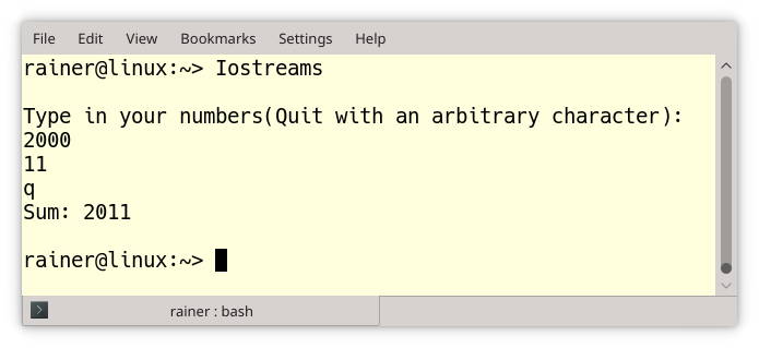 // Iostreams.cpp #include <iostream> int main(){ std::cout << std::endl; std::cout << "Type in your numbers(Quit with an arbitrary character): " << std::endl; int sum{0}; int val; while ( std::cin >> val ) sum += val; std::cout << "Sum: " << sum << std::endl; std::cout << std::endl; }