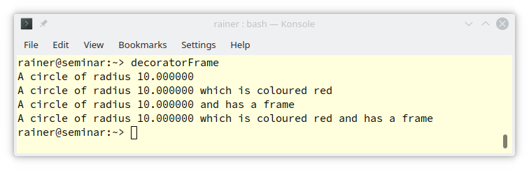 // decorator.cpp (based on https://en.wikipedia.org/wiki/Decorator_pattern) #include <iostream> #include <string> struct Shape { virtual ~Shape() = default; virtual std::string GetName() const = 0; }; struct Circle : Shape { void Resize(float factor) { radius *= factor; } std::string GetName() const override { return std::string("A circle of radius ") + std::to_string(radius); } float radius = 10.0f; }; struct ColoredShape : Shape { ColoredShape(const std::string& color, Shape* shape) // (1) : color(color), shape(shape) {} std::string GetName() const override { return shape->GetName() + " which is colored " + color + "."; // (2) } std::string color; Shape* shape; }; int main() { std::cout << '\n'; Circle circle; ColoredShape colored_shape("red", &circle); std::cout << colored_shape.GetName() << '\n'; std::cout << '\n'; }
